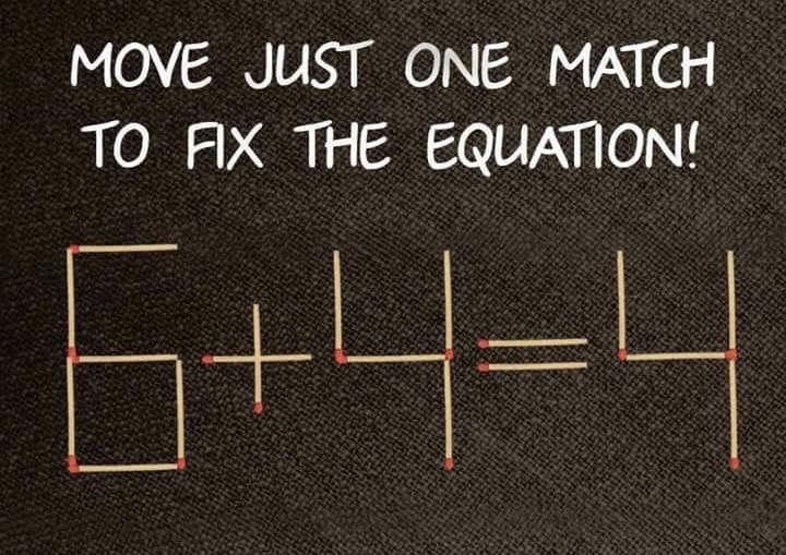 Puzzle: Move Only One Match Stick 3 solutions to this puzzle… Share this: Share on X (Opens in new window) X Share on WhatsApp (Opens in new window) WhatsApp Like Loading... Related One thought on “Puzzle: Move Only One Match Stick” Add yours Take the left bottom vertical one and place it on top of the answer 4. LikeLike Reply Leave a comment Cancel reply Δ This site uses Akismet to reduce spam. Learn how your comment data is processed.