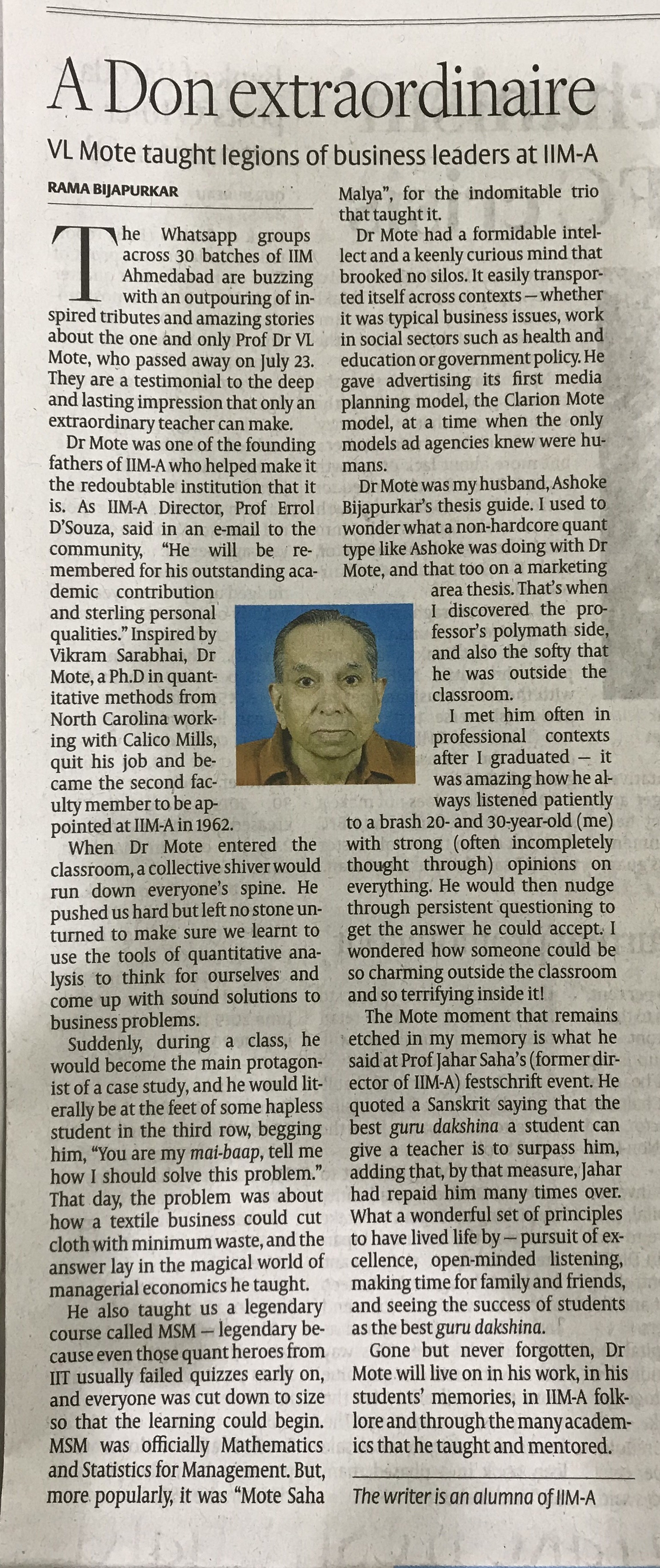 The reason I thought of writing this is the sad news I heard recently. One of IIM-A founding faculty members, Prof. Mote, passed away recently. I never had privilege of knowing him or interacting with him. Some retired Profs do visit IIM-A and interact with students, and I too was lucky to interact with a couple of such legends. But not Prof. Mote.