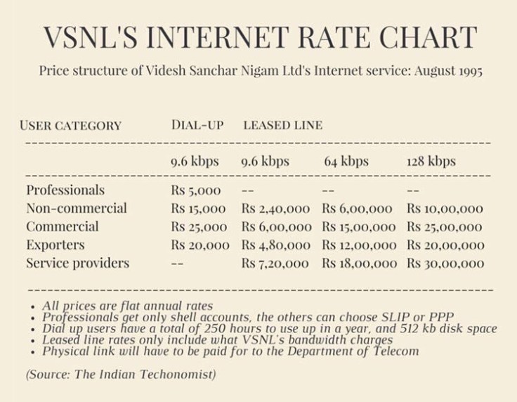 Today in 1995: Internet services were launched in India by Videsh Sanchar Nigam Limited. The rate chart: