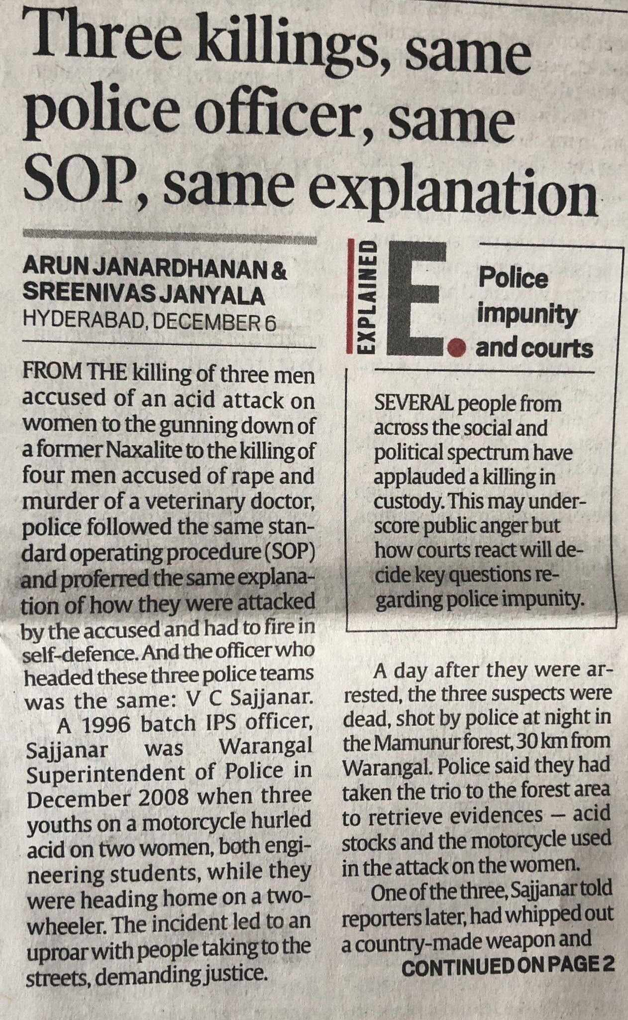 Here are a couple of news reports which actually questioned the encounter by police. The rest are cheering for the heroic act.