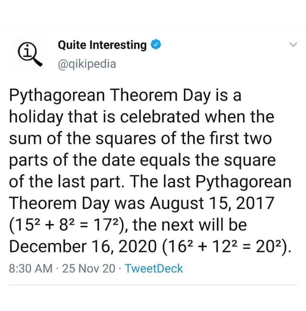 Today is #PythagoreanTheoremDay. Also known as “Right Triangle Day,” it’s a day when the sums of the squares of the month and day equal the square of the last two digits of the year. Clever and elusive, we’re celebrating it now because the next time this happens is in 2025! 📐