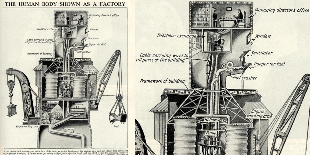 Old illustration of the “Human Body as Factory.” (Note the “Managing Director’s office in the brain.) Magnified at right. From “The World of Wonder,” edited by Charles Ray, c 1932.