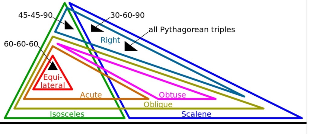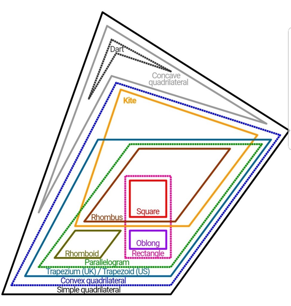 If a diagram merely shows some relationships between sets but not all (perhaps because not all imaginable combinations exist), it’s called an Euler diagram (pronounced “OY-ler”). Here are two showing triangle and quadrilateral types