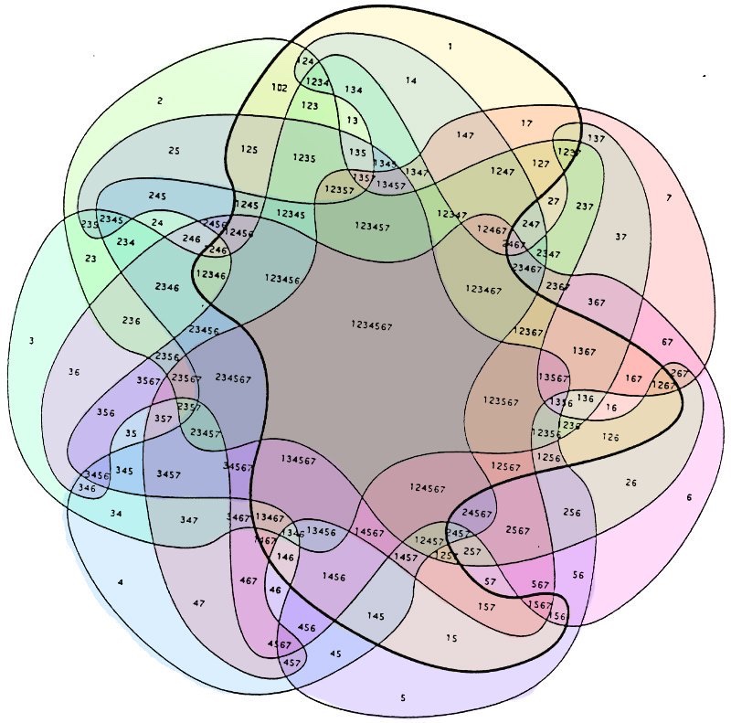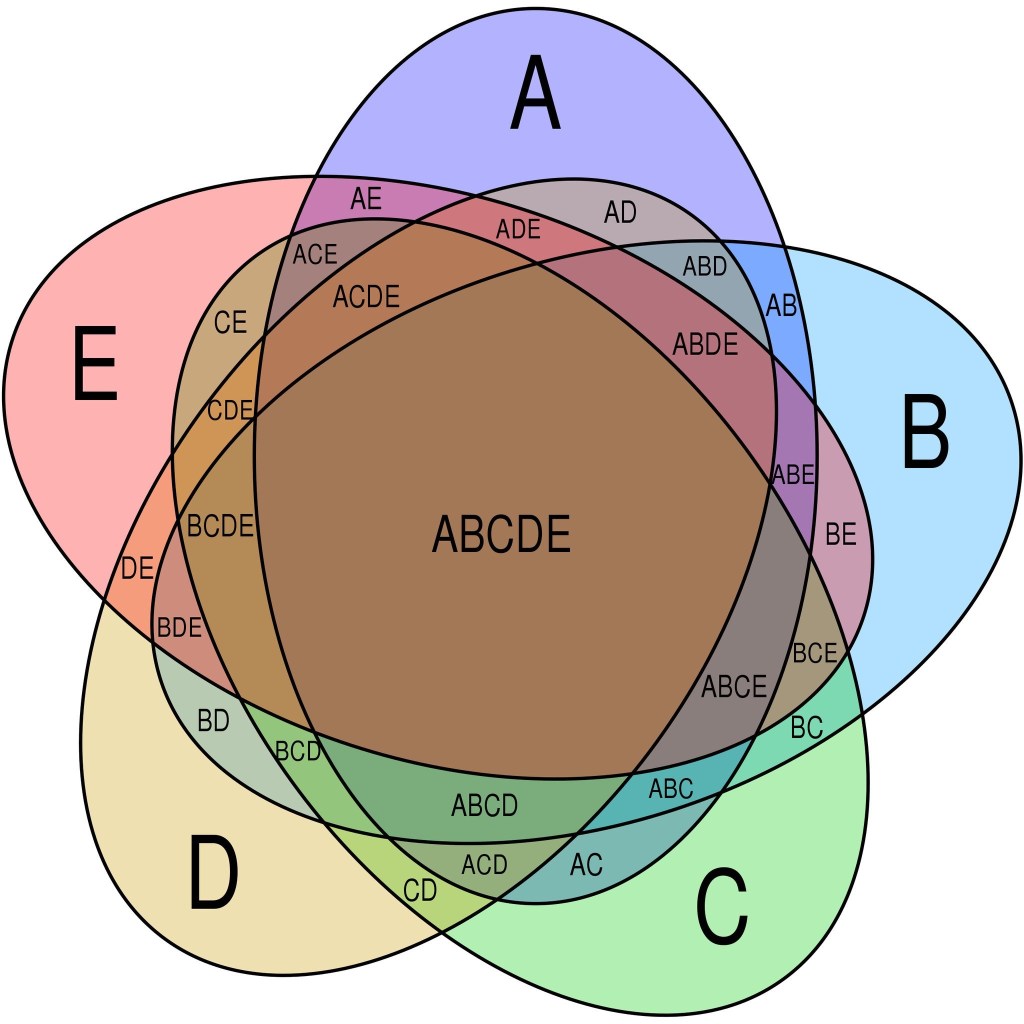 As it turns out, rotationally symmetric Venn diagrams can only be made with a prime number of sets. Here’s one such diagram with 5 sets. It was devised by Branko Grünbaum in 1975.
