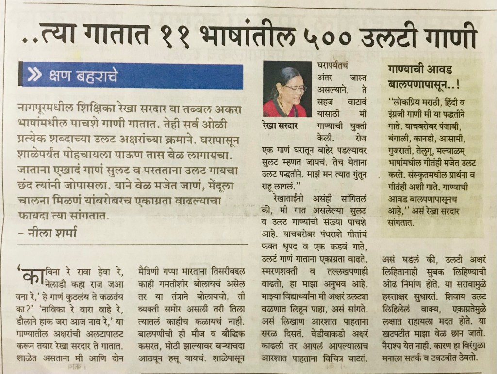 लिम्का बुक छाप रेकॅार्डस् ही अनेकदा अशी आचरट आणि अनाकलनीय असतात. ४ वर्षाच्या मुलाला ४० देशांच्या राजधान्या सांगता येतात. एखादा माणूस काचेचे बल्ब, ट्यूब खातो. एखादा केसानी ट्रॅक्टर किंवा कार ओढतो. कोणी एका मिनिटात ५० जिलब्या खातं. कोणी नाकानी पिपाणी वर गाणं वाजवतं (तेही कुठलं तरी देशभक्तीपर गाणं). एकानी कोणीतरी २०-२५ वर्षे मिश्या वाढवल्या होत्या (लॅाकडाऊन मध्ये बऱ्याच लोकांनी त्या पराक्रमाची बरोबरी करायचा प्रयत्न केला). ह्या नागपूरच्या बाई ५०० गाणी उलटी म्हणू शकतात. असो. त्यांचे छंद…आपण कोण त्यांना नावं ठेवणारे (हे यथेच्छ टीका करून झाल्यावर म्हणायचे! 😎).