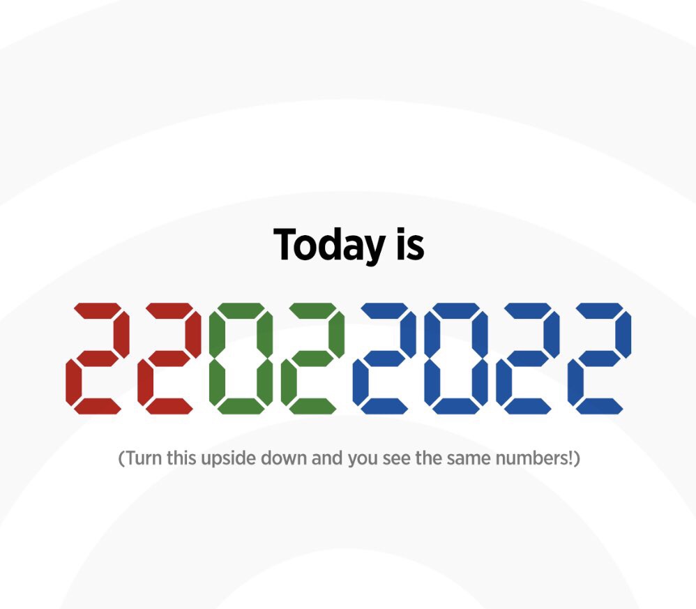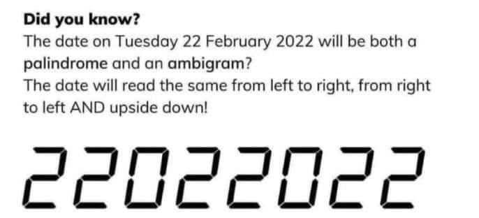 At 22 seconds past 22 minutes past ten in the evening of the 22nd day of the 2nd month of the 22nd year this century (which falls on a Tuesday, or TwosDay), the time and date will consist of a single repeating digit: the last occasion this will happen in our lifetimes. In the date format dd/mm/yyyy, 22/02/2022 is also a palindromic date, i.e., is read the same backwards as it is forwards.