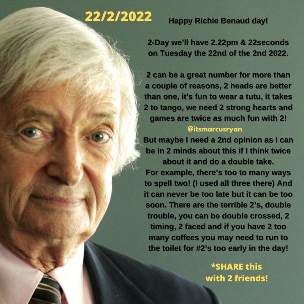 22/2 is also called Richie Benaud Appreciation Day because of his peculiar style of saying Two – “Tew for Twenty Tew”