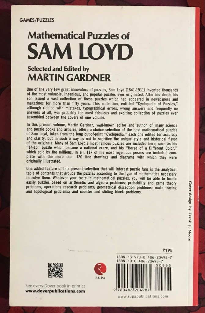 Sam Loyd (1841-1911) was a well-known American chess player, chess composer and puzzle author. I had read his book of mathematical puzzles selected by the legendary puzzle composer and columnist Martin Gardner.