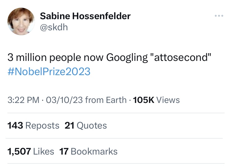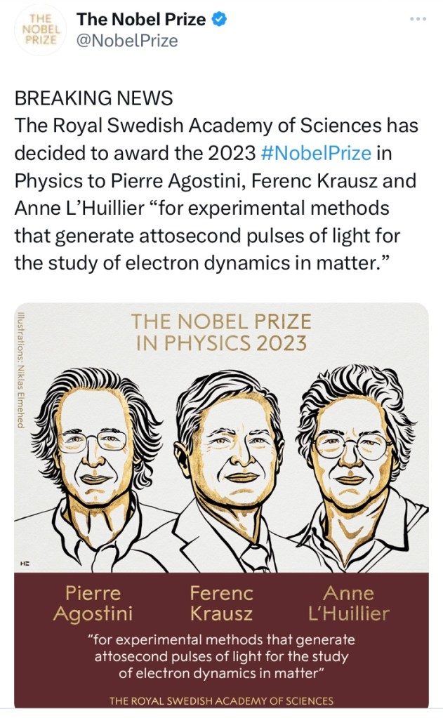 TheNobel Prize 2023 was no exception. A tweet on Google surge in “Attosecond” caught my attention and I followed the trail to get some interesting details.