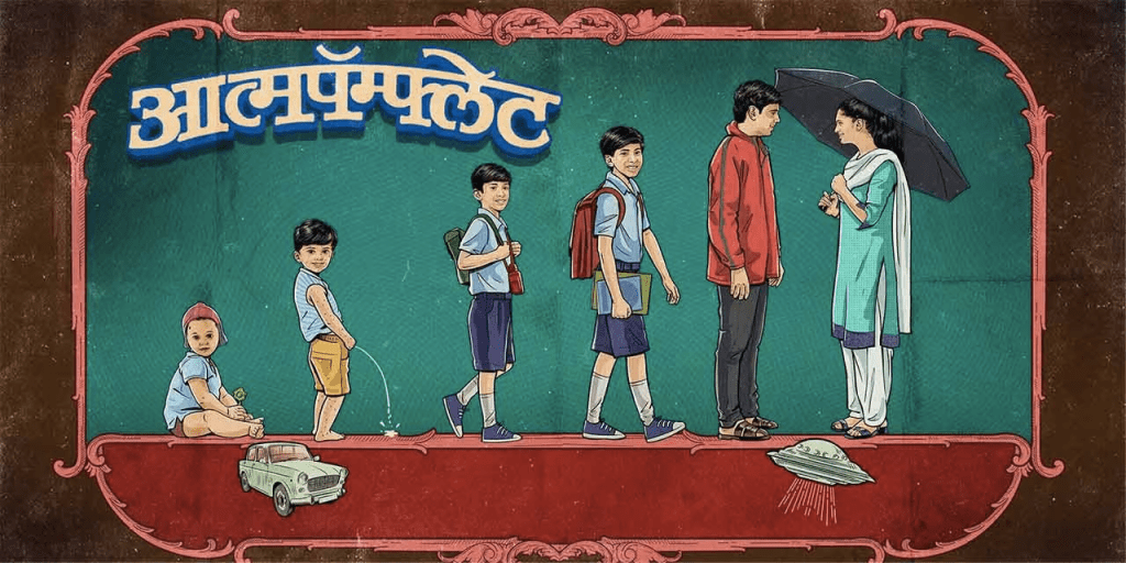 त्यानंतर अगदी नुकताच “आत्मपॅम्फ्लेट” असे विचित्र पण लक्षवेधी नाव असलेला चित्रपट ६ ऑक्टोबर ला अजिबात गाजावाजा न करता प्रदर्शित झाला. आशिष बेंडे या नवोदित दिग्दर्शकाने दिग्दर्शित केलेला आणि परेश मोकाशी याने लिहिलेला. आशिष हा गेली काही वर्षे परेशचा सहाय्यक दिग्दर्शक आहे. आत्मपॅम्फ्लेट हे आशिषच्या आयुष्यातील घटनांवर आधारीत कथानक आहे. थोरांची चरित्र असतात. सामान्यांचं आयुष्य एका पानावर, म्हणजे pamphlet वर लिहिता येईल इतकं नगण्य असतं – म्हणून आत्मचरित्र न म्हणता “आत्मपॅम्फ्लेट”! ही कल्पनाच मला आवडली!