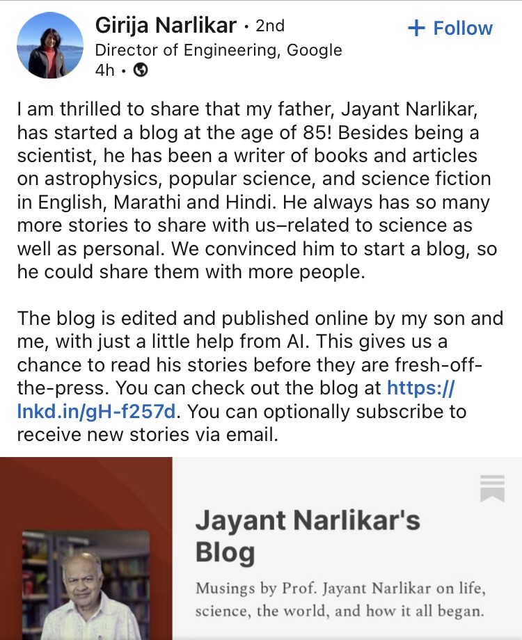So it was an exciting news to see this Linkedin post from Dr. Narlikar’s daughter