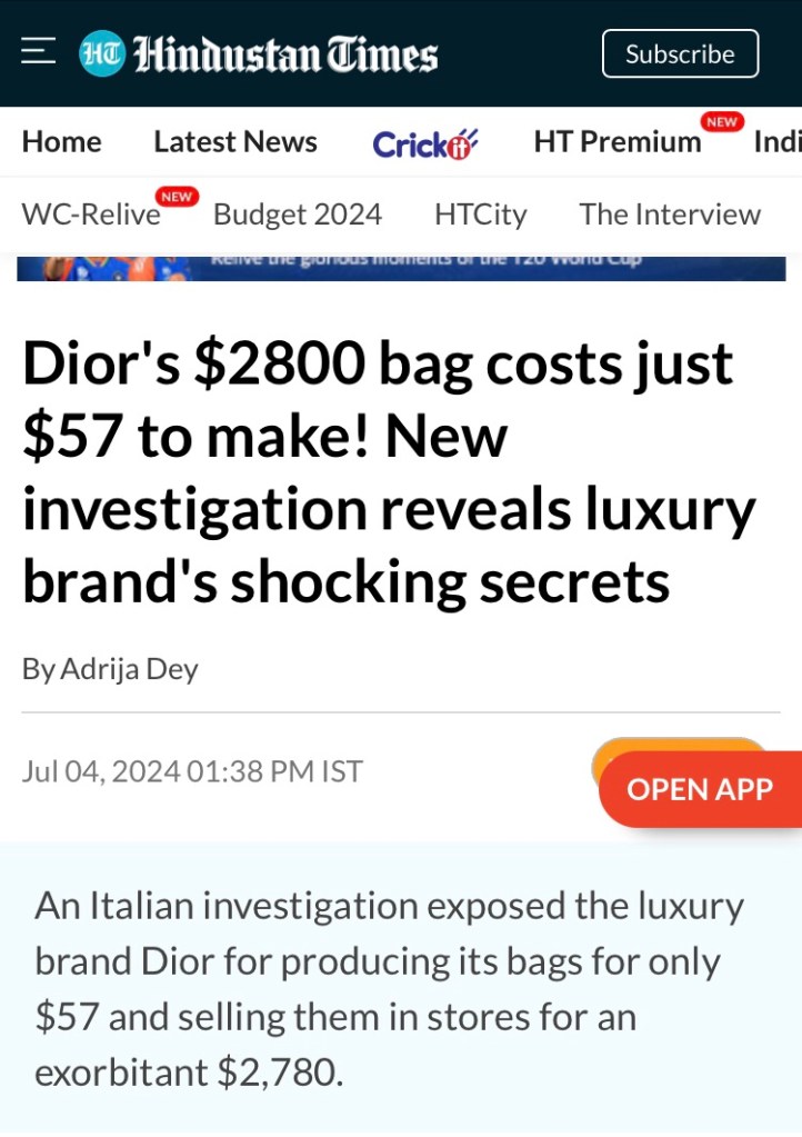 Here is an example of Idiot Index. The Dior’s $2800 bag costs just $57 to make!